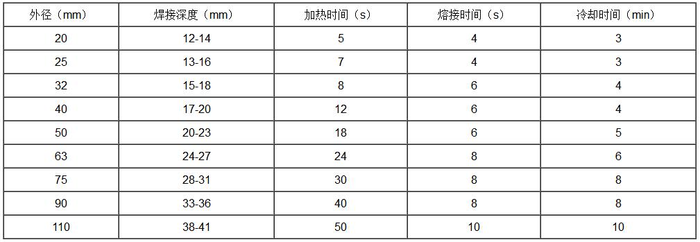 注:1、熱溶承接溫度260±10℃,本表適用的環(huán)境溫度為20℃,低于環(huán)境溫度時(shí),加熱時(shí)間可適當(dāng)延長;